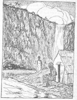 The youngest sister went along the river bank until she could no longer see the village. She had never been so far away from it before. At last she came to a place where the river leaped over a great cliff. Under the waterfall was a hut with an old woman sitting at the door. She was bent and wrinkled and very, very ugly, and she looked up as the youngest sister looked down at her from the bank.