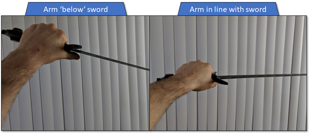 Has the arm below the sword (instead of inline, like a normal horizontal cut)