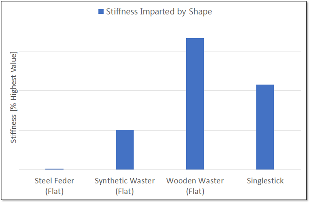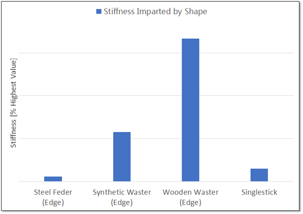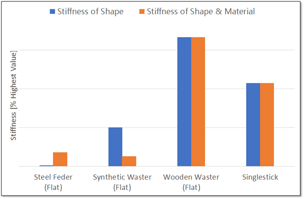 The cross section of the synthetic waster is much thicker than the feder, but once you account for the material differences between the steel and nylon, the overall stiffness of the steel feder ends up noticeably higher. The wood isn’t as stiff as the steel, but it’s just so much thicker that it doesn’t matter. That singlestick is going to thrust HARD.