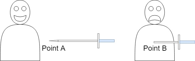 If instead we rotate about the shoulder, we get a speed multiplication effect at the tip. The part of the sword that meets the target will be moving much faster than the hand.