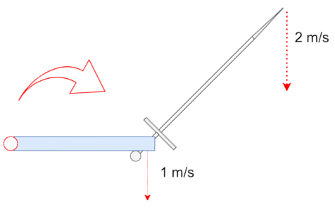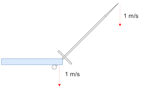 What do I mean by this? Imagine if you just hold the sword and chop straight down. The tip is moving at the same speed as the hilt. If you move your hilt at 1 m/s, the tip moves at 1 m/s.