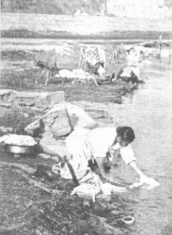 The native woman spends half her life laundering. At any time of the year a group may be seen at the side of any stream washing, even when the surface ice must be broken to reach the water. They have no wash-boards, but place the garment on a flat rock and beat it with a wedge-shaped wooden washing-stick. When once more white, and this is only after long, laborious effort, the clothes are dried and saved until after all other housework is finished at night.