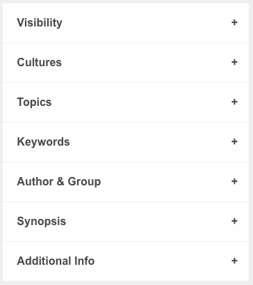 Finally, there’s the Additional Info pane. These fields, like all the metadata fields, are entirely optional. If you are adding historical letters or documents, put the author’s name in the Author field. If you are the author of the article, leave this blank; you’ll be automatically credited. If you include a location or a date range, those will be displayed in the header banner on the article page. The Location field will accept any location information that might be relevant. The Start Year and End Year fields accept numerical values only. The Primary Type dropdown menu allows you to identify your article type as an essay, an editorial, a primary source document, a recipe, and more.