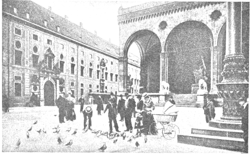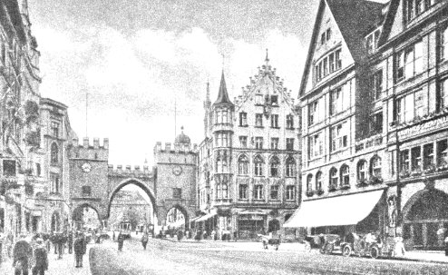 I resolutely started out, bareheaded and tousled and probably not overclean. It was a distance of nearly a mile, along quiet Louisenstrasse, then across a large plaza with fountains and monuments, and through an ancient portal—a relic of the days when Munich was a fortified city. This led into a lively, crowded business street. I squirmed my way through, unconcerned and unnoticed, until I reached the wide plaza with the great equestrian statue, the royal Opera House on one side, and my destination, the King’s Palace, on the other.